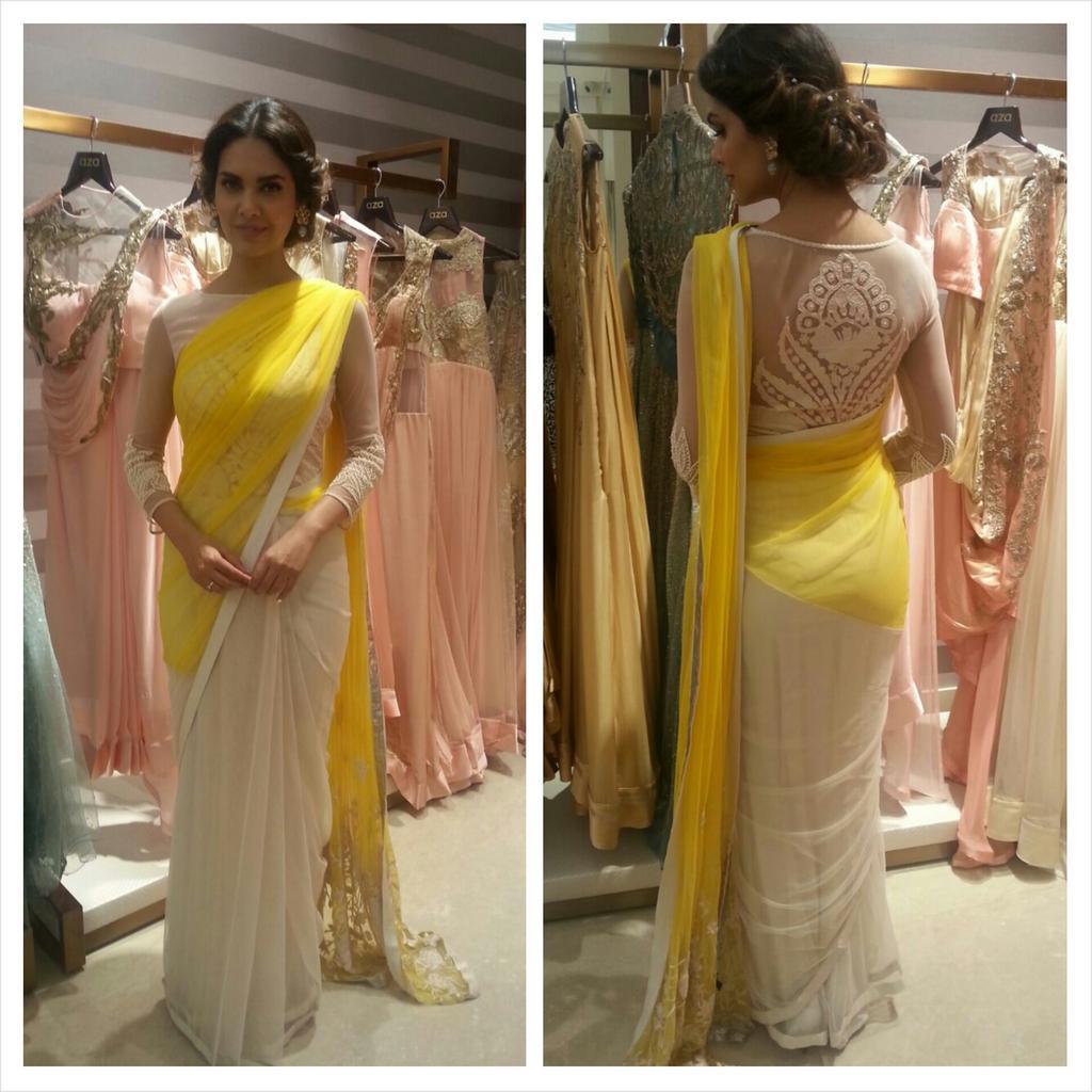Bollywood actress Esha gupta in beautiful white and yellow half and half saree designed by varun bhal at AZA store launch event .embroidery work comes on the edge of pallu followed by yellow net pallu and blouse designed by embroidery full sleeves boat neck high neck pattern.